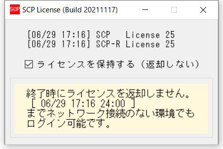 オンライン状態でSCP起動後にSCPライセンスを開きライセンス保持の操作を行う事で、当日の24:00まで保持することができます。
