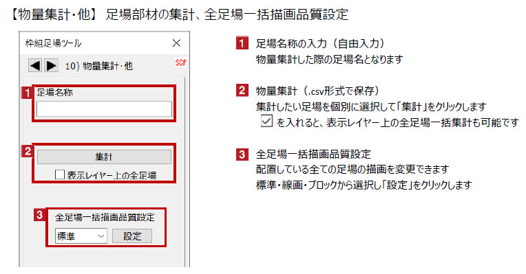 操作マニュアル「04 枠組足場」P6の【物量集計・他】を参照下さい。