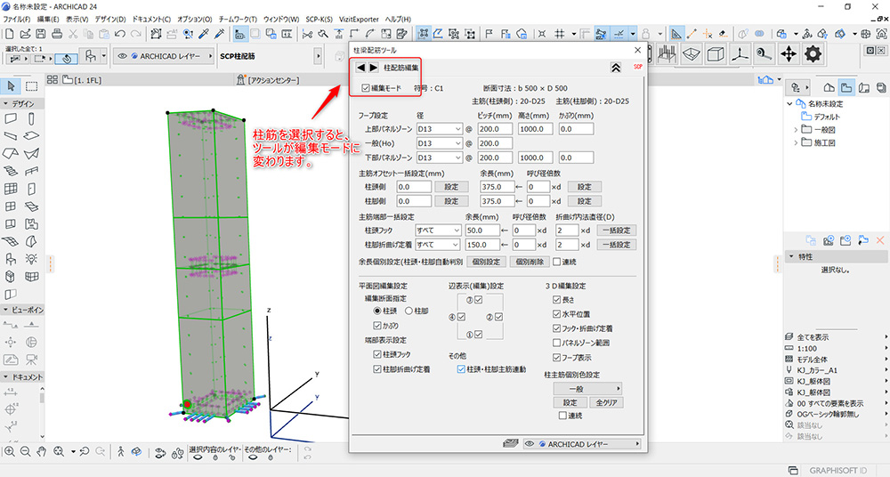 配置した配筋を選択して頂きますと、柱梁配筋ツールの画面が編集モードに切り替わりますのでそちらから編集することができます。